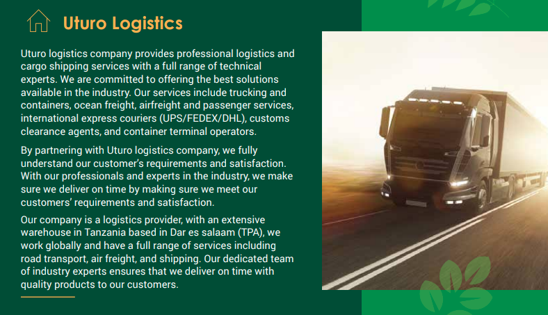 Uturo Logistics Company LimitedUturo Logistics Company LimitedUturo Logistics Company Limited is a part of a group of companies that operate in the logistics sector. The company is primarily focused on providing logistics solutions which include transportation, warehousing, and distribution services, warehouse and Transportation, Machines Leasing, Agribusiness, General Services, Industrial PPE, Work